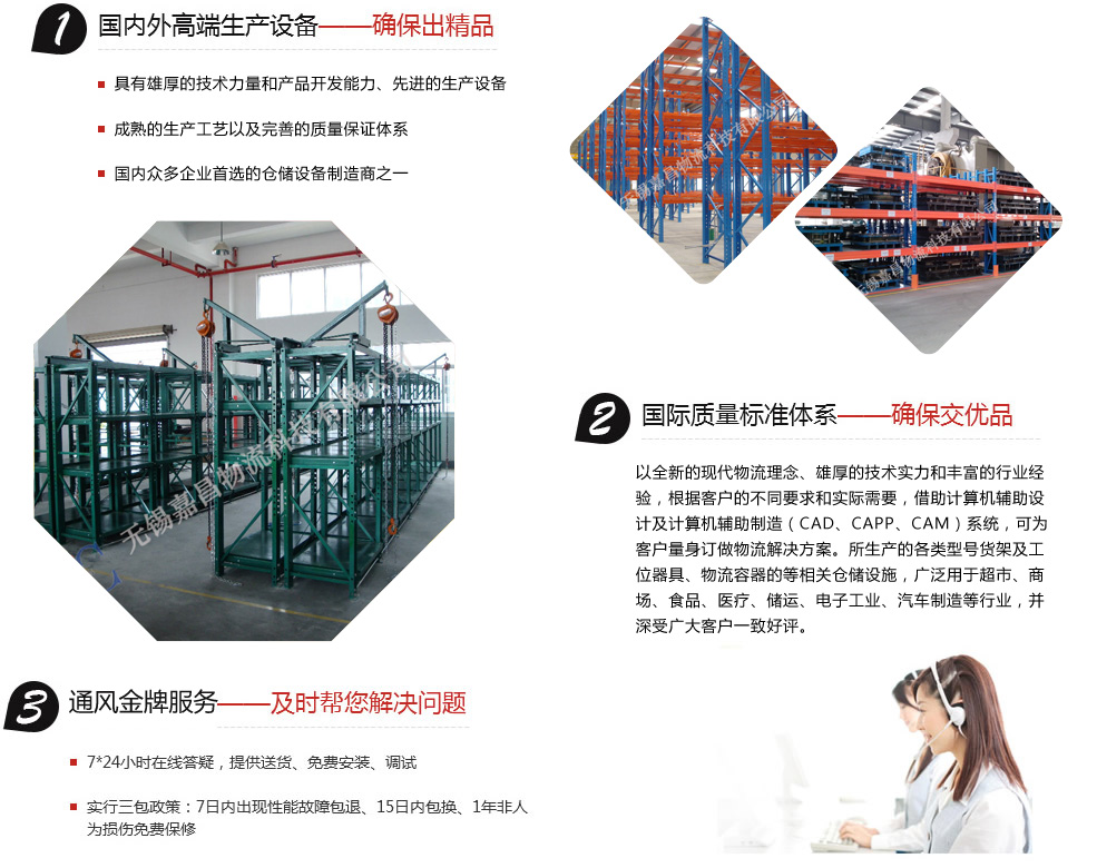 無(wú)錫嘉昌倉(cāng)儲(chǔ)貨架有限公司是國(guó)內(nèi)現(xiàn)代倉(cāng)儲(chǔ)物流技術(shù)開(kāi)發(fā)、設(shè)計(jì)、生產(chǎn)和安裝的專業(yè)廠家,具有雄厚的技術(shù)力量和產(chǎn)品開(kāi)發(fā)能力、先進(jìn)的生產(chǎn)設(shè)備、成熟的生產(chǎn)工藝以及完善的質(zhì)量保證體系。公司始終“以質(zhì)量求生存,以信譽(yù)求發(fā)展的”的經(jīng)營(yíng)理念,放眼世界,積極引進(jìn)、吸收國(guó)際物流行業(yè)先進(jìn)技術(shù),憑借專業(yè)的制作經(jīng)驗(yàn)、優(yōu)秀的產(chǎn)品質(zhì)量,是國(guó)內(nèi)眾多企業(yè)首選的倉(cāng)儲(chǔ)設(shè)備制造商之一。